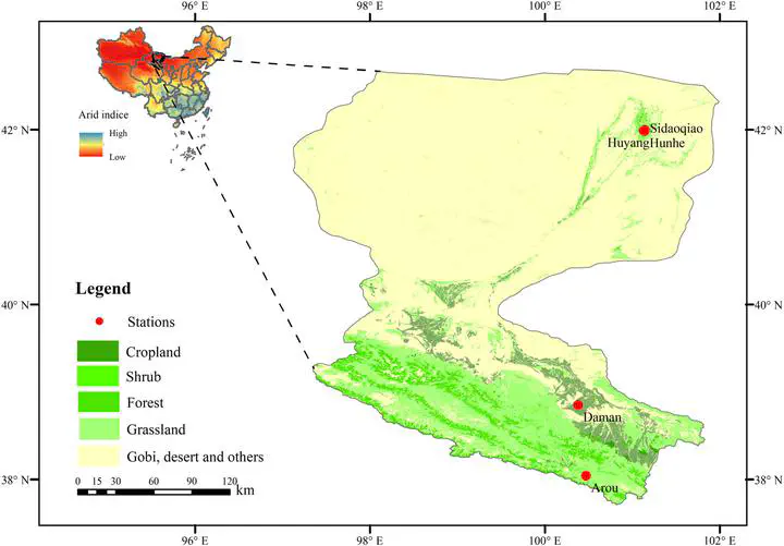 Understanding the constraints on light-use efficiency (LUE) induced by high evaporative water demand (vapour–pressure deficit; VPD) and soil water stress (soil moisture content; SMC) is crucial for understanding and simulating vegetation productivity, particularly in the arid and semi-arid regions. However, the relative impacts of VPD and SMC on LUE are unclear, as we lack a mechanistic understanding of impacts and their interactions. In this study, we quantified the relative roles of VPD and SMC in limiting LUE and analysed the interactions among VPD, SMC and LUE using data from CO2 and water flux stations and weather stations along a climatic gradient in the Heihe River Basin, China. We found a threshold of VPD constraint on LUE; above the threshold, LUE decreased at only 3.6% to 23.1% of the rate below the threshold. As SMC decreased, however, the VPD threshold increased, and the reduction of LUE caused by VPD decreased significantly, which is more than half of that in moister regions. Therefore, both VPD and SMC played essential roles in LUE limitation caused by water stress. A threshold also existed for heat flux and the correlation between SMC and LUE; the strength of the correlation first decreased and then increased with increasing VPD. Our results clarified the relative impacts of VPD and SMC on LUE, and can improve simulation and prediction of plant productivity.